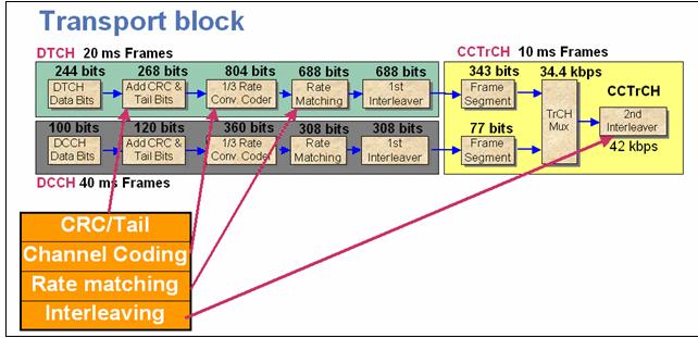 误码率(BER)定义为所接收错误比特数与所有发送比特数之比[3]。此处的比特为卷积∕加速解码器输出处的信息比特。当测试装置测量环回误码率时,它在下行链路的专门流量信道(DTCH)上向UE发送一个在环回模式中配置的已知数据码型。UE解码该数据,把它在上行链路DTCH上再次发送。测试装置分析上行链路数据,了解它与原先在下行链路上发送比特的接近程度。测试装置每次比较下行链路和上行链路数据的一个传输块。测量结果,即误码率,为接收到的不正确比特数与发送至UE总比特数之比。当测试UE接收机性能时,假定上行链路是无错的。任何上行链路上产生的错误都使接收机测试无效。 原来的12.2kbps RMC实现:图2示出专用物理数据信道(DPDCH)的结构,它由多路转换DTCH数据和专用控制信道(DCCH)构成。在每一20ms DTCH帧内产生244bit数据,使原始数据率为244bit/20ms = 12.2kbps。接着增加24个循环冗余检验(CRC)和尾比特,然后把整个数据块加至1/3率卷积编码器。再在每804bit编码数据中穿孔掉126bit,留给下一级的就只有688bit。在环回测试期间,已知测试数据码型经DTCH发送,构成12.2kbps RMC。